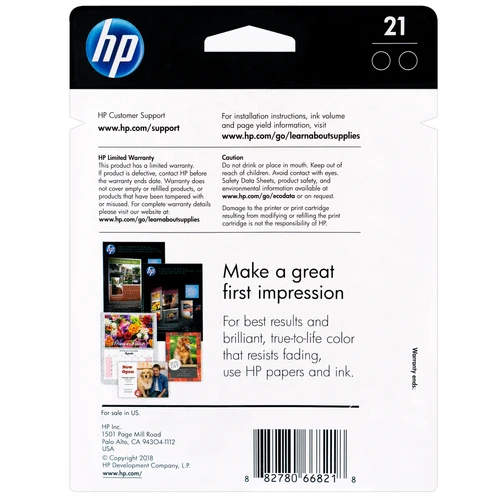 This Original HP 21 C9508FN Black Inkjet Cartridge is designed to work with HP Deskjet 3910, 3915, 3930, 3930v, 3940, 3940v, D1320, D1330, D1341, D1360, D1420, D1430, D1455, D1520, D1560, D2330, D2345, D2360, D2430, D2445, D2460, F2110, F2140, F2280, F335, F340, F380, F4135, F4140, F4180 Fax 1250, 3180 Officejet 4315, 4315v, J3640, J3680 psc 1410, 1410v printer models. By using the Original/OEM HP 21 C9508FN Inkjet Cartridge you will always get clear, sharp text and graphics.